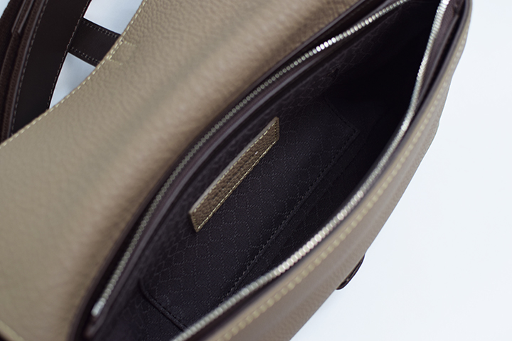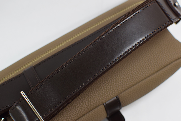 ショルダーストラップには混合鞣しの国産牛革を採用しており、本体部分のシュランケンカーフとの素材のコントラストが良い雰囲気を醸し出しています。