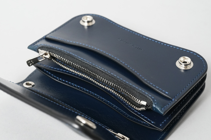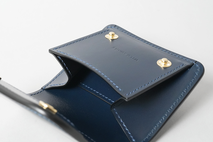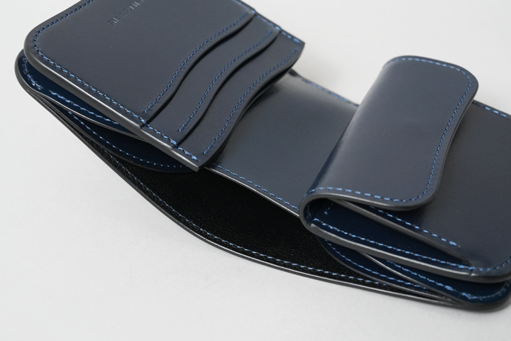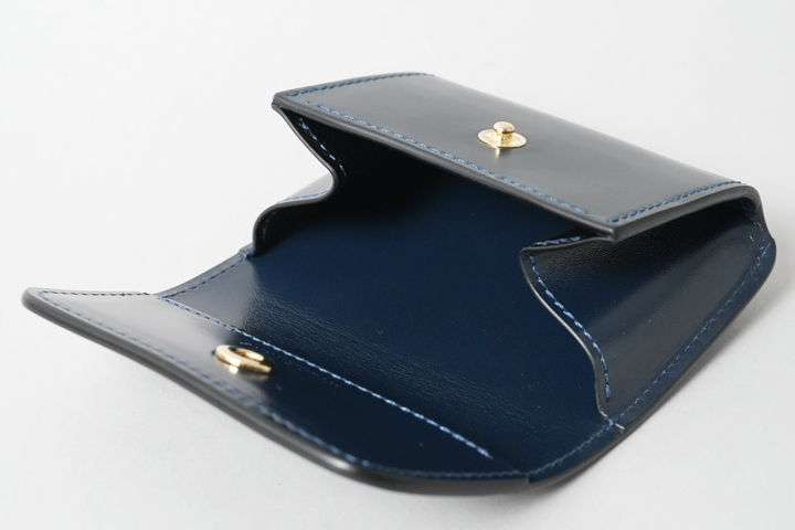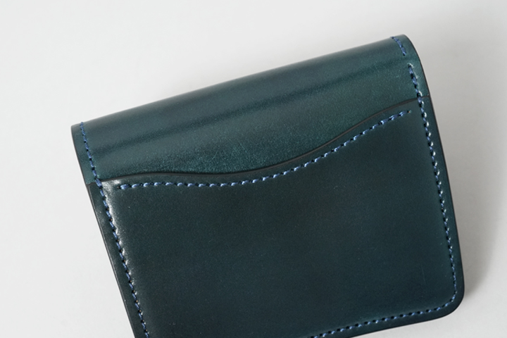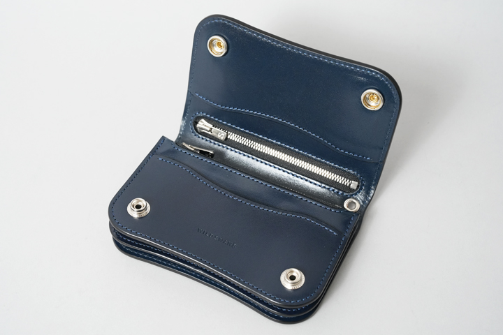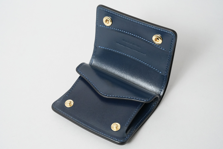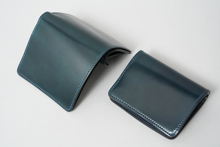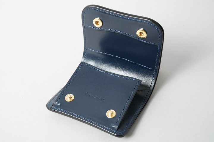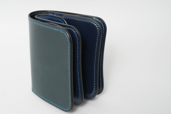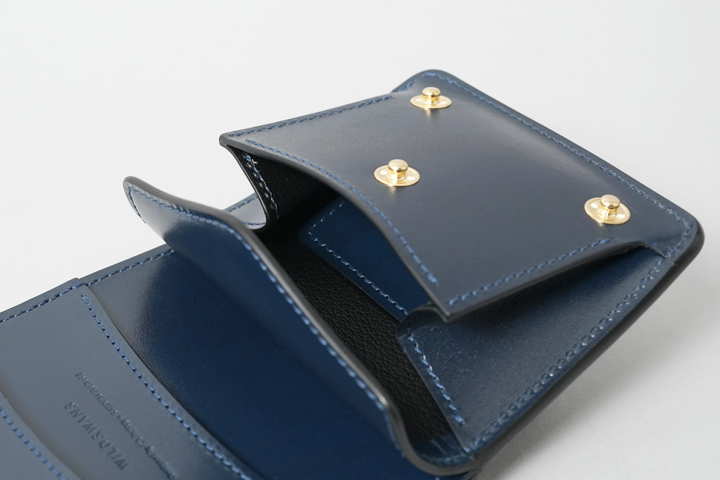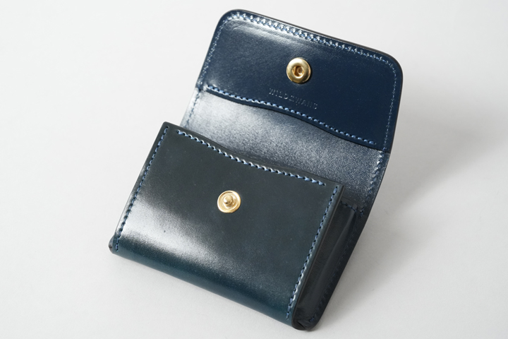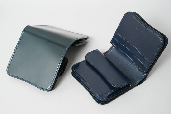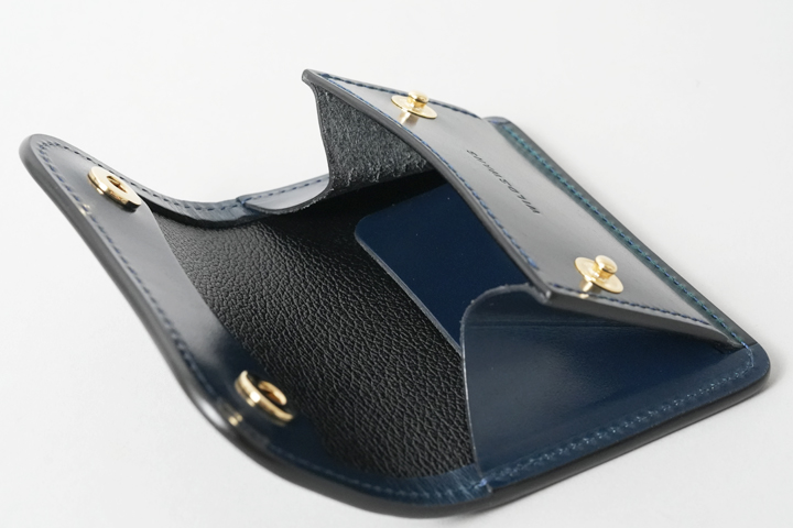 シェルコードバン/インテンスブルーの内装には、サドルプルアップレザーの特別カラー/フレンチネイビーを合わせています。堅牢で耐久性が高いベルギー牛革・サドルプルアップはWILDSWANSの定番素材として長く愛されている皮革です。フレンチネイビーはしっとりと落ち着きを感じる雰囲気をまとっており、シェルコードバン/インテンスブルーと組み合わせることで調和のとれた製品に仕上がりました。