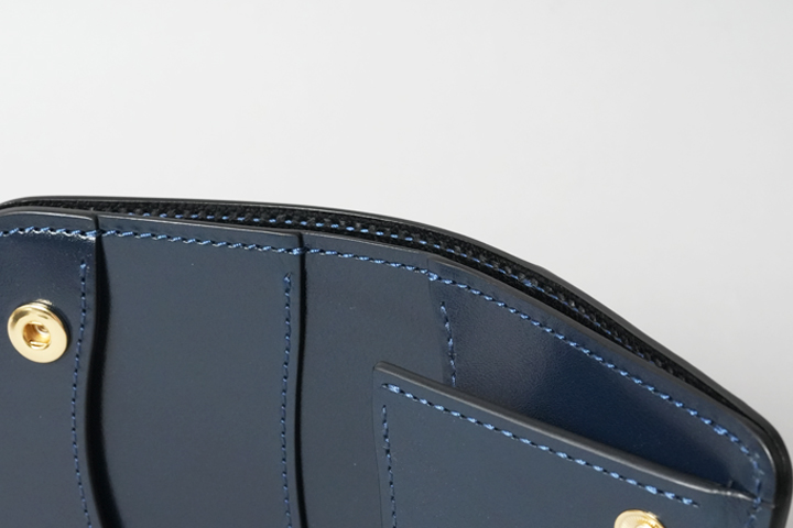 両脇を谷折りのマチで囲まれたコインケースは、内部に仕切りを備えています。仕切りの奥側にカードをまとめて入れて頂ければ、省スペースで硬貨とカードを収納することができます。