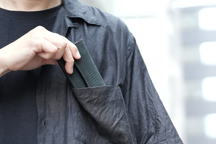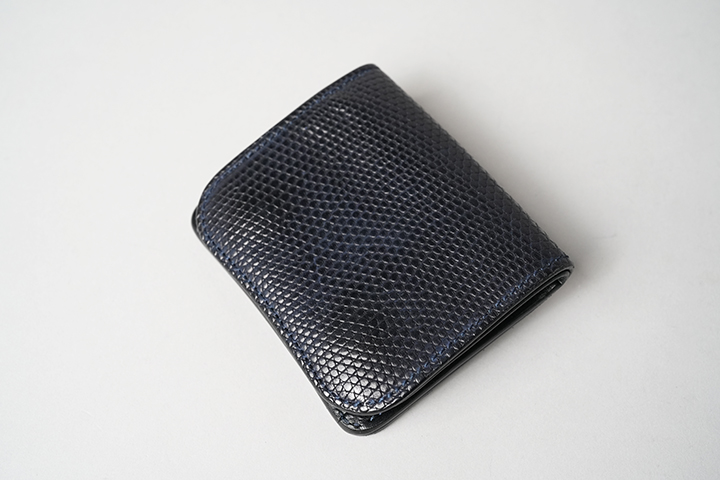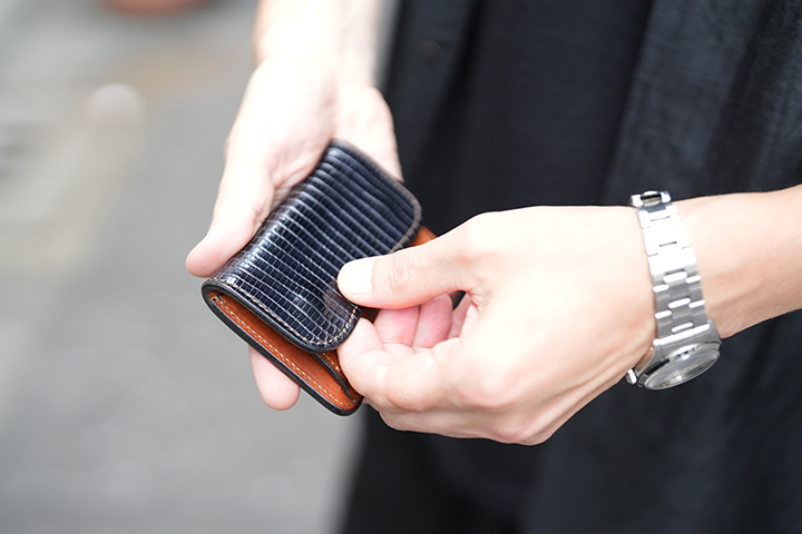 PLAM-V2とは異なる特性を持つCASAも当シリーズに登場します。一見するとPALM-V2とよく似た外観のCASAですが、本体上部の折り曲げ部分からフラップの先端にかけて少しシェイプするようにデザインされている点が外観の相違点です。CASAにも背面にカードポケットを備えています。フラップとその下のパーツには意図的に段差を設けることで、フラップが指に掛かりやすい設計が採用されています。内装においては、コインケースに専用フラップを備え、さらにこのコインケースは両サイドの大きなマチを前後に可動します。この仕組みによって、フラップの手前にコイン、奥に6~7枚のカードをまとめて収納することができます。本体サイドの札室は裏貼りが施され、すべての日本紙幣の出し入れもスムーズです。コンパクトであるからこそ、リザードの存在感が引き立つCASAのご紹介でした。