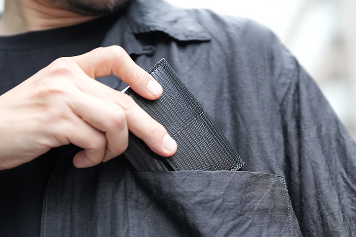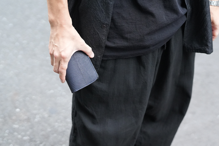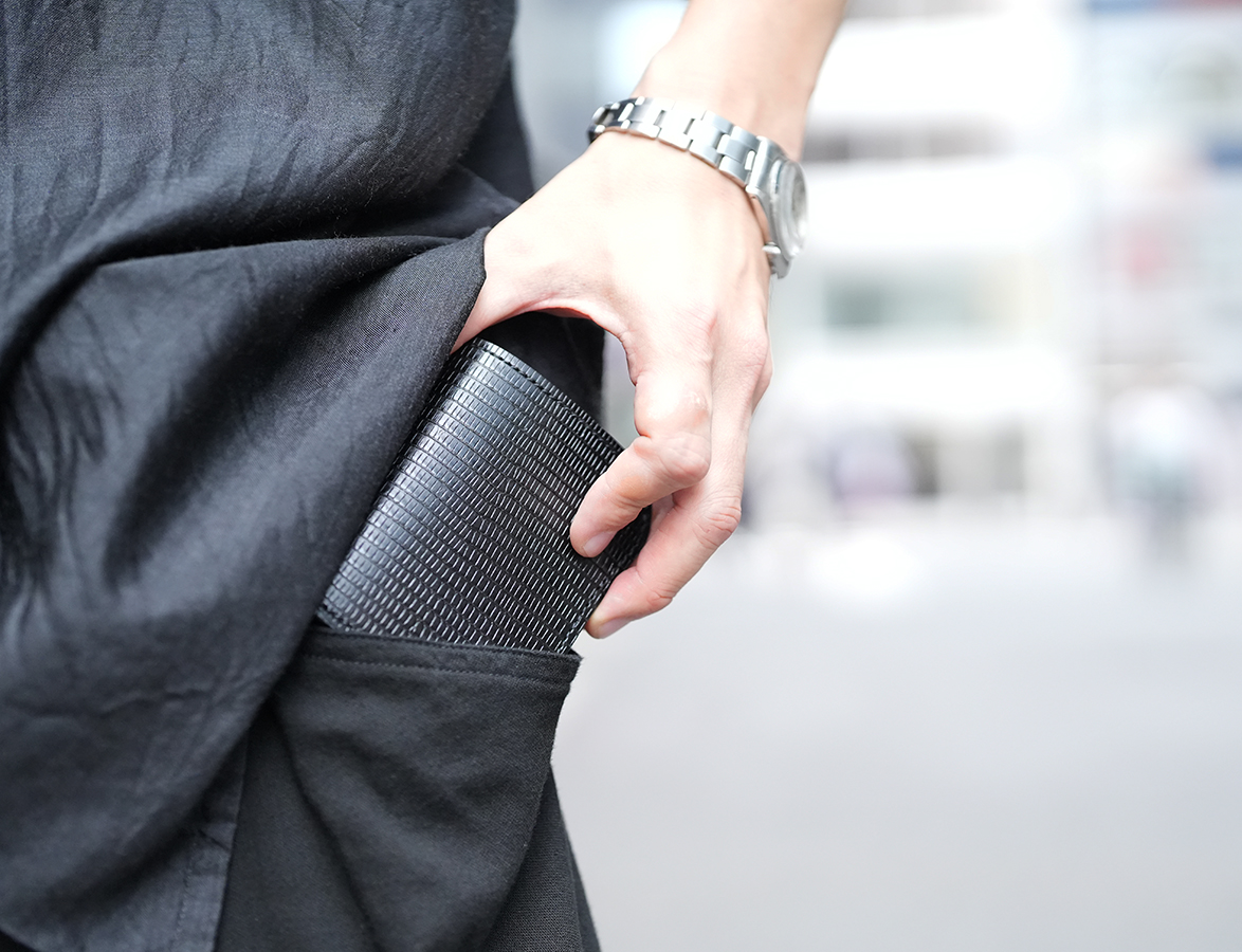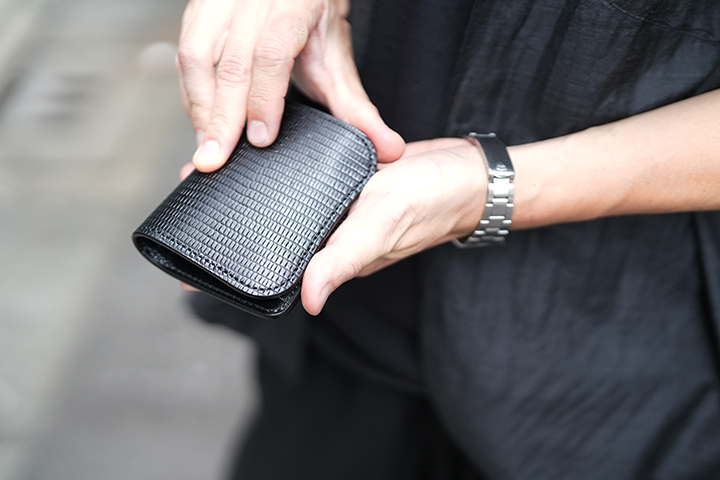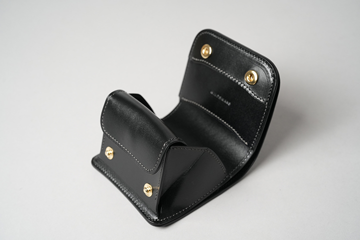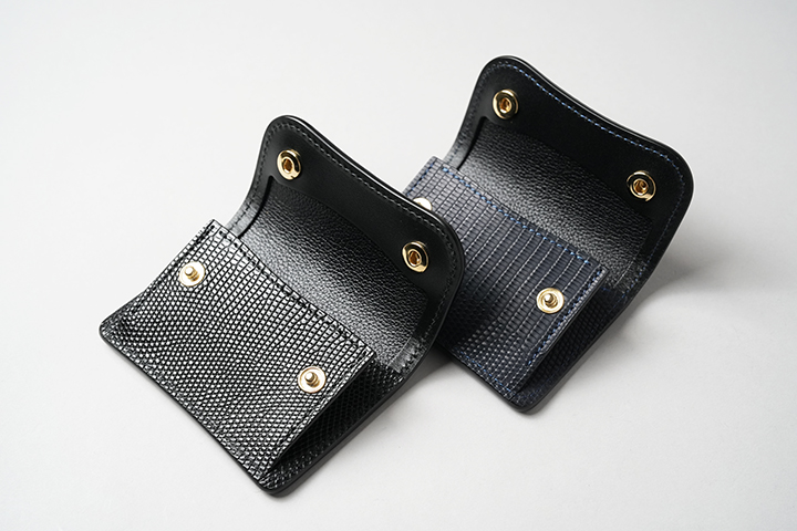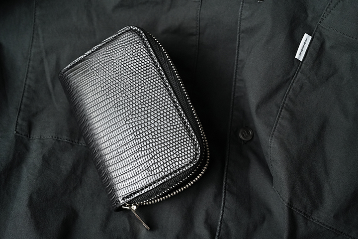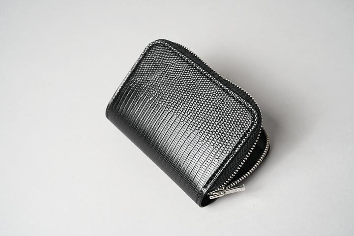 カードケースあるいはコインケースとしても使用できるマルチなアイテムのARTHURもWILDSWANSでは小振りな部類に属するアイテムです。リザードを使用したフラップから背面まではポケットがなく、シンプルかつミニマルな外観が特徴です。フラップの中央に配置した1点のホックを外すとメイン収納部が現れます。カード類は背面側に収納しますが、名刺だと約30枚、プラスチック製カードでは約15枚がこちらに収納可能です。前身側にカードの収納はできませんが、代わりにコインやSDカードなどが収納できます。鱗が小振りなリザードはクロコダイルよりも控え目なイメージであることに加えて、今回はブラックでのカラー展開となっていることからビジネスシーンでもマッチしやすいアイテムに仕上がりました。