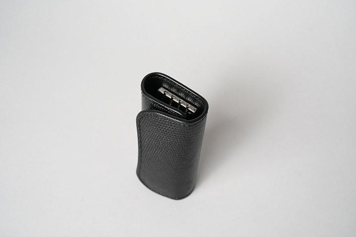 こちらは2023年に改良版として誕生した比較的新しいキーケースです。細身の筒状のフォルムは手に馴染みやすく、コンパクトなそのフォルムにより収納場所を選びません。また、本体の片側には金属のアイレット加工が施され、こちらにはWILDSWANSのカラビナキーリングSまたはMなどを装着することができます。さらにカラビナキーリングにレザーストラップのLEGAREを接続することで様々なスタイルでの使用が可能であると同時に紛失防止にも一役買います。リザードの外装を開くと、サドルプルアップ/ブラックの内装が現れます。内装の中央部分には4連のキーフックが取り付けられています。日常生活において財布以上に使用頻度が高いキーケースのCLIPPERⅢは、手に触れる機会が多いアイテムとなることからリザードのエイジングも早く進むことが期待できます。