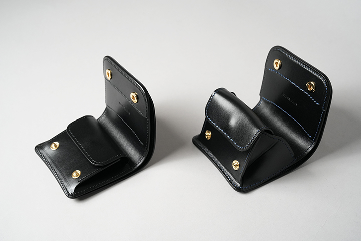 WILDSWANS とドメスティックブランドのCorbo.のチーフデザイナーである古瀬聡氏のコラボレーションシリーズ「Walkersシリーズ」の代表作kf‐003。まだミニ財布が全盛になる前から展開する貴重なアイテムです。PALM‐V2やCASAと異なり、フラップから背面にかけてポケットなどが一切なく、すきっりとした外観が特徴です。kf‐003もフラップとその下のパーツに段差を設けているので、指がフラップへ自然にかかるように工夫されています。内装は専用フラップ付きのコインケースと本体サイドに設けた札室からなるオーソドックスな仕様です。なお、カードはコインケース内の仕切りの奥に2~3枚、コインケースの背面に1枚収納することができます。ブラックのリザードをまとうことで、よりスマートな風貌となったkf‐003にもご注目ください。
