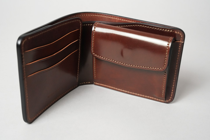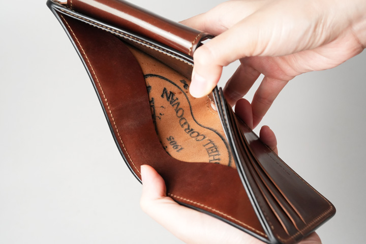 内装左にはカード収納部、右にはコインケースを設けています。すべてシェルコードバンで作り込まれた内装は圧巻の一言です。