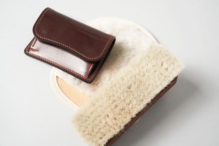 先ほどご紹介したフルシェルコードバン/ENOですが、実はそれほど繊細なお手入れは行っていません。シェルコードバンは油分を潤沢に含んでおり、クリームやオイルを塗布することで、かえって曇りの原因になる場合が多くあります。クリームの塗布は極力控え、水気と汗を避けながら、乾拭きやブラッシングといった乾いたお手入れに留めるのが効果的です。またブラッシングの際は、毛が柔らかい山羊毛ブラシをお使いいただくのがおすすめです。