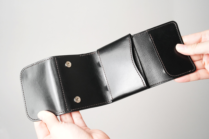 2か所あるホックをすべて解除してみました。全長だけで言えば長財布と同程度の長さがありますが、耐久性を損なわない程度に皮革の厚みを調整し、折り紙のように折り畳まれているのです。