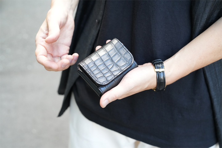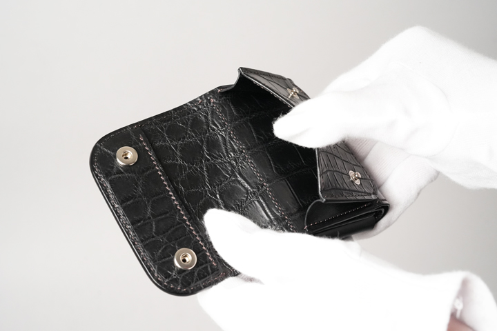 ちなみに、クロコダイル/STELLAのコインケースはクロコダイルが全面的に見える贅沢な仕様となっています。定番仕様の製品であるにもかかわらず、フラップを開いた内部にクロコダイルを使用するのは初めてのことです。