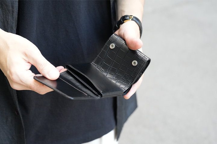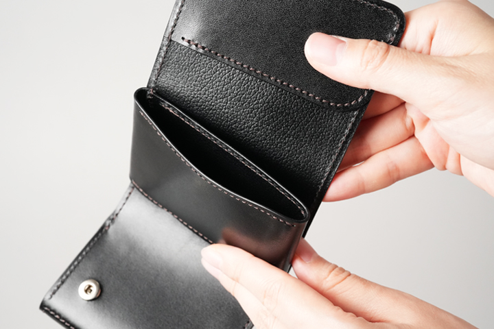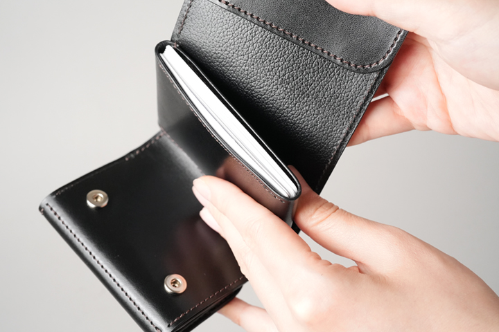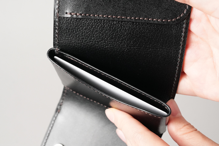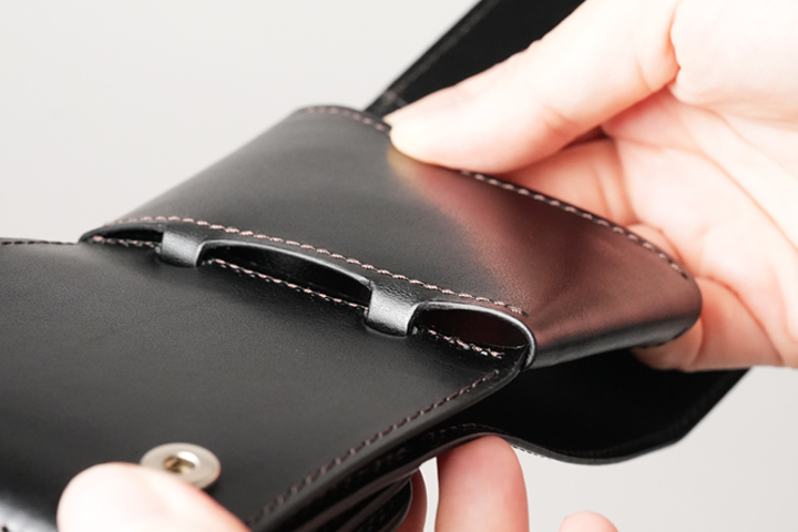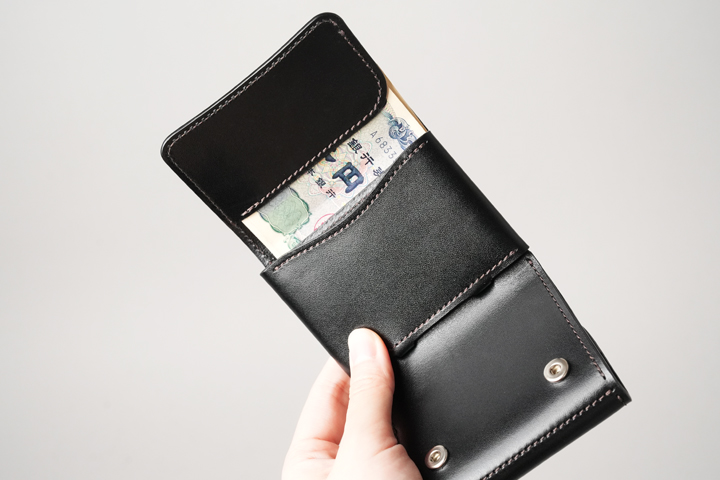 一室構造の札室ではなく札ばさみ型の収納スペースにすることで、使用する皮革量が減っています。開口部はあおりポケット状に縫製されているため、軽やかでスピーディな使用感がミニウォレットと好相性です。上の画像では20枚の紙幣を収めており、収納力も申し分ありません。