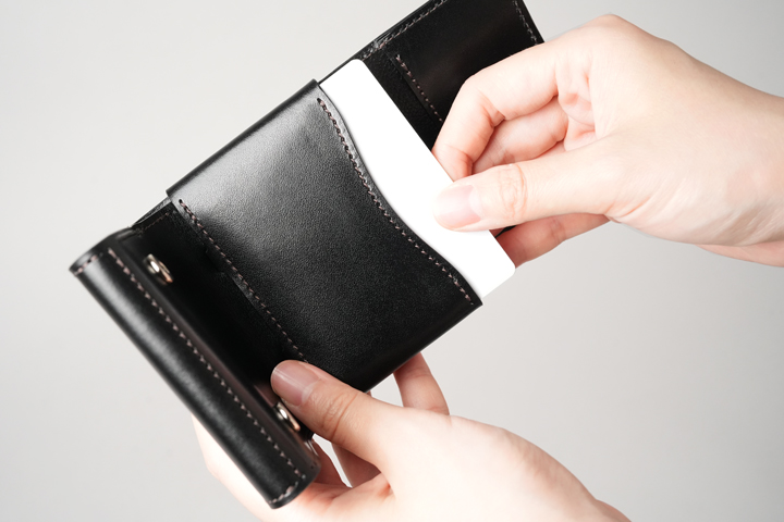 カードの枚数が少ない場合はそこまでホールド力は高くなりませんが、内装を折り畳む際にカード収納部の開口部が覆われる構造のため、落下の心配がない設計になっています。
