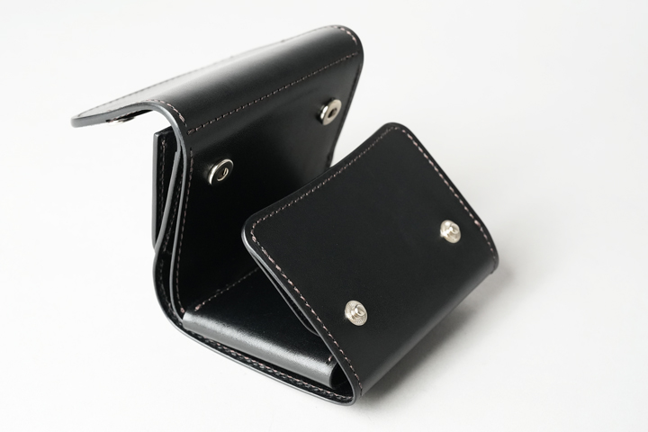 WILDSWANS 製品の中では珍しく、コインケースは製品の外側に面しています。小ぶりな本体に合わせて従来よりも小さなホックを使用しており、製品の軽量化の一因となっています。ブランドのロゴは、コインケースの前身部分に刻印されています。