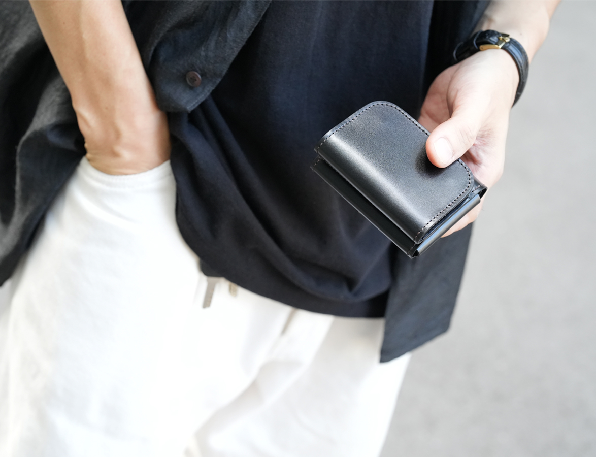 ブランドの誕生より26年。WILDSWANSがこれまで生み出してきた革製品は数知れず、特に財布類は豊富なラインナップを展開してきました。無骨で重厚感があるからか、昔は大きく厚みのある革財布がブランドの主流だったものです。しかし時は流れ、時代は社会も物品も軽量化の一途を辿っています。金銭の支払いも現金からキャッシュレスへと急速に移行しつつあり、人に求められる財布の形もまた、小さく軽く、さりげないものへと変化していきました。