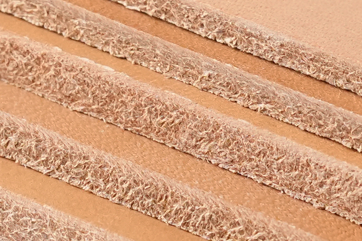 ローラーによる仕上げは一般的ですがハンマーを使用した仕上げは非常に珍しく、この工程によって皮革の厚みは25%失われますが、代わりに繊維密度が高まって強度と耐水性が向上します。