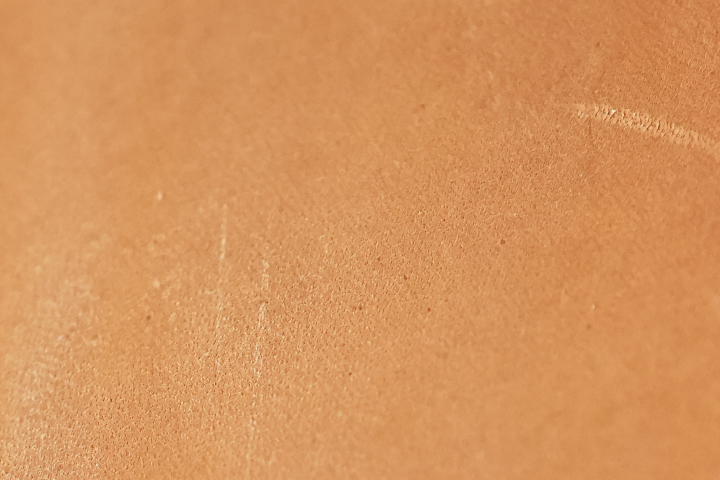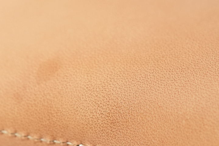 明るい色味で、また表面に加工を行っていない皮革のため、原皮由来、或いは皮革製造工程で生じる傷やシワ、色ムラといったものが含まれます。