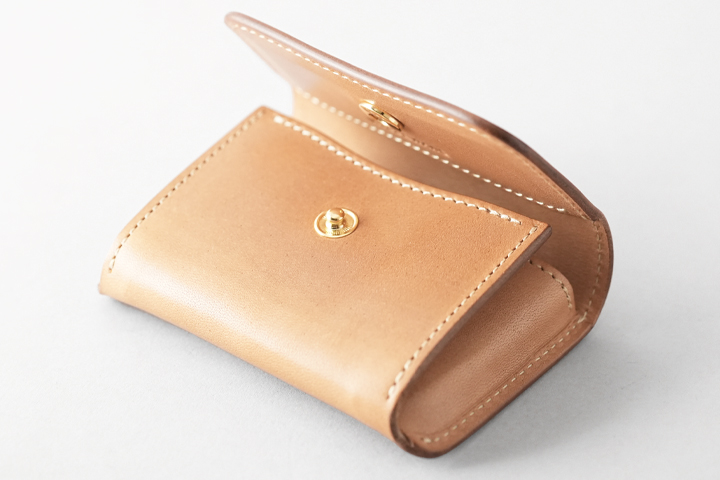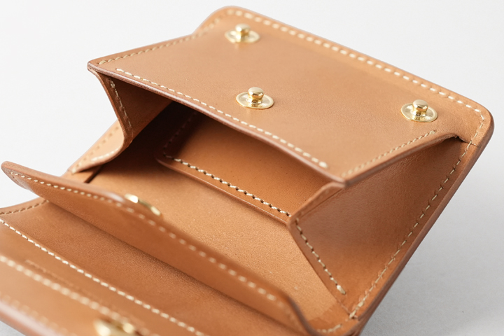 大まかに言えばフラップの付いたコインケースですが、背面にはカードポケットが一つ、また左右にマチの付いたメイン収納部のコインケースには仕切りパーツが設けられ、パーツ裏にカード類や三つ折りの紙幣を挟んで収納することが出来ます。