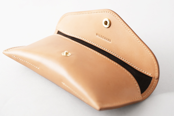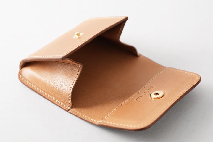WILDSWANSの名刺入れには珍しいフラップ式のホック、フラップ裏側には小さなメモなどを収納可能なポケットを備えています。 メイン収納部は少し変わった形状のマチが左右に設けられており、手前と奥のスペースでそれぞれ幅が異なります。