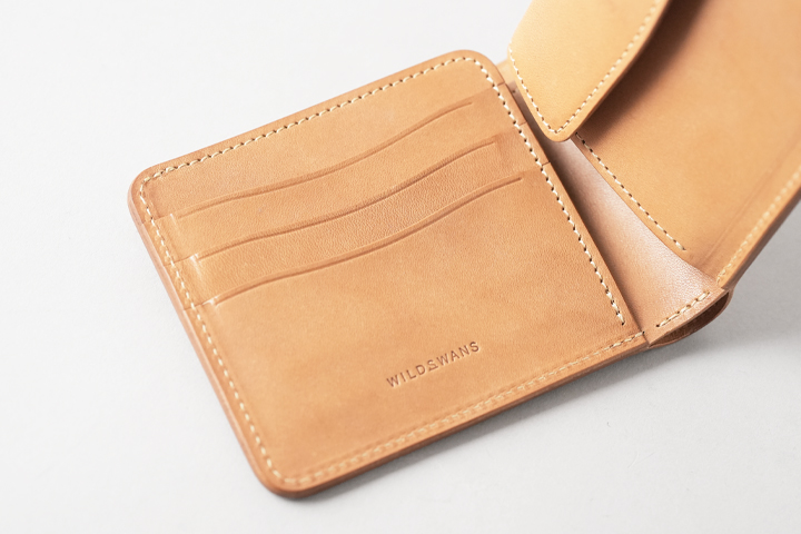 WILDSWANSのミニ財布系のアイテムは背面にカードポケットが定番ですが、このモデルは外装に収納部を持たず、一枚革のシンプルな外装が特徴です。
