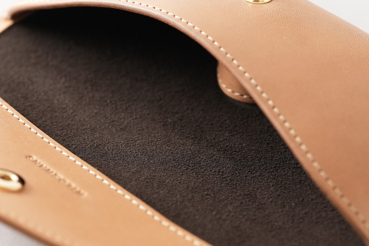 フラップはホック式で、内装にはスエードが敷き詰められレンズやフレームに優しい設計です。 内装の中央には山形のパーツが取り付けられており、ここに眼鏡のノーズパッドを合わせて収納します。