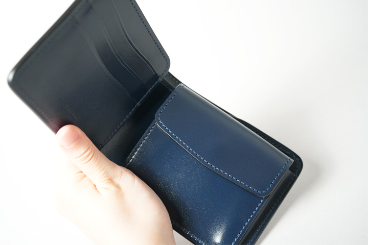 The WINGS is a simple wallet with a bill compartment, six card slots, and an L-shaped pocket on both sides. The bill compartment allows easy insertion and removal of banknotes and can also store tickets and other long items.