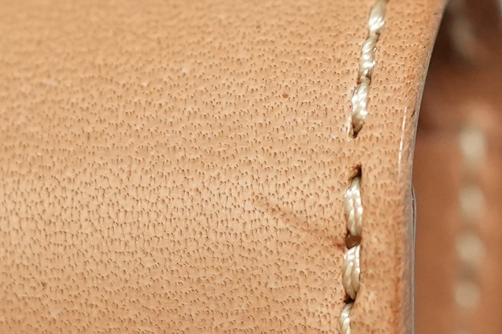 ・製品製作時において、分厚い箇所や製造工程上で力の加わる部分に関しては摩擦や圧力によって部分的に色が濃くなったり、パーツの重なる部分やミシンの押さえなどによる押し跡(凹凸)などが生じます。