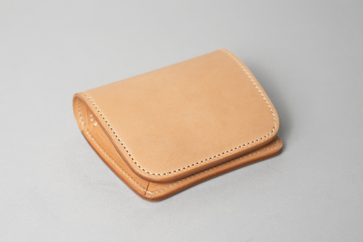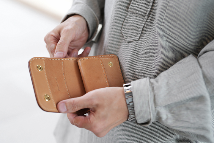 主な仕様は外装にカードポケット1室、内装に大きなマチを設けたフラップ付きのコインケース、サイドから出し入れする札室となっています。TONGUEと同様に、外装のカードポケットには使用頻度の高いカードの収納にご利用ください。フラップ付きのコインケースは傾けながら開いても中身がこぼれる心配はありません。大きなマチによってプラスチック製カードは最大6枚ほど、コインは最大20枚ほど持ち運ぶことができます。手のひらサイズの財布ですが札室は余裕を持ったサイズ設計になっており、さらに総革仕様であることから日本紙幣の出し入れが容易です。 扱いやすい形で現金派の方にもキャッシュレス派の方にも十分な容量を持っていますので、ご自身用はもちろんのこと、記念日などの贈り物にもおすすめのアイテムです。