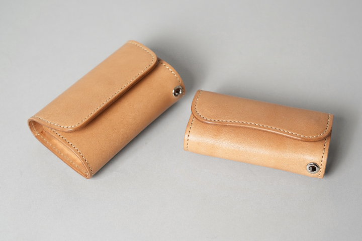 どちらも一枚革を使用した筒状タイプでスッと手に馴染むコンパクトな設計です。WILDSWANS特有の指をかけやすく開きやすい流線のデザインによって、可愛らしい印象もあります。その他の共通した仕様として、シルバーのホックと右下へのハトメ加工、内装にamiet社の4連キーフックが取り付けられています。キーフックは大が1つ、小が3つになっており、使い分けができるようになっています。