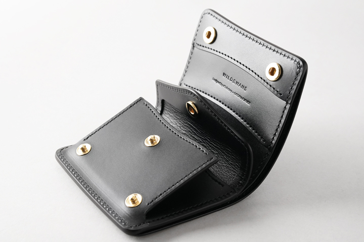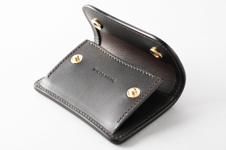 WILDSWANS定番の、機能的なコインケースです。 素早く・確実に開閉が可能な2点のホック付きのフラップを備え、内部のコインケースは左右のマチによって容量豊富です。 本体背面のマチなしポケットやコインケース内の仕切りパーツによって、カードや畳んだ紙幣なども収納出来るため、ポケットサイズながらお財布、パスケース、カードケースなど様々な用途に対応致します。