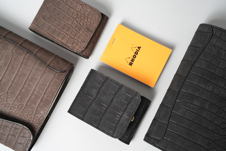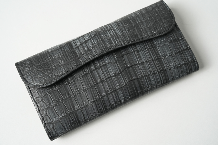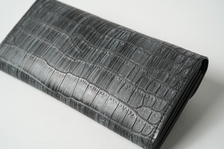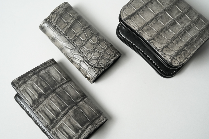 クロコダイルの中でも最高級に位置するポロサスを天然の墨で染め上げた神秘的なシリーズ。水墨画を思わせる静謐(せいひつ)な空気をまとっています。染まり具合が強すぎない分、使い込んだ時の色味の変化も楽しみです。