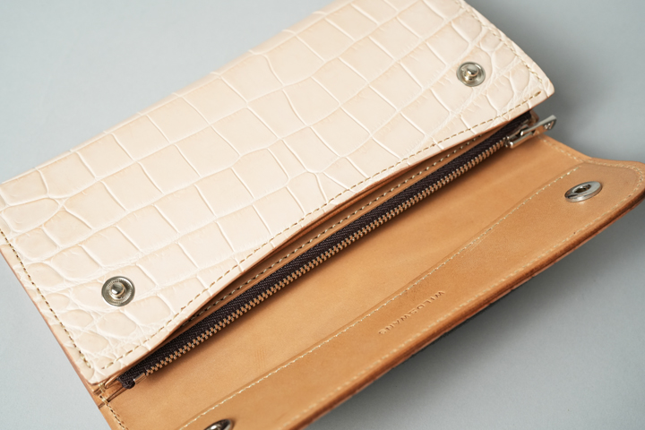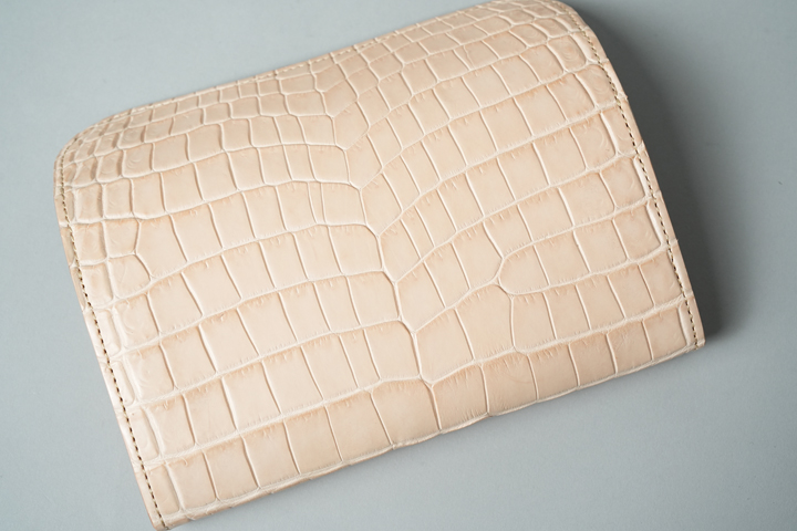 無染色の皮革同士を組み合わせたクロコダイル/WAVE。乳白色のクロコダイルからは、普段のイメージと離れた無垢(むく)な印象を受けます。軽やかなカラーリングの一方で、しっかりと繊維密度の詰まった重厚感も備えており、エイジングによる色味の変化をたっぷりと堪能できるアイテムです。