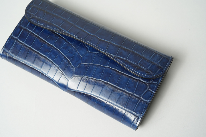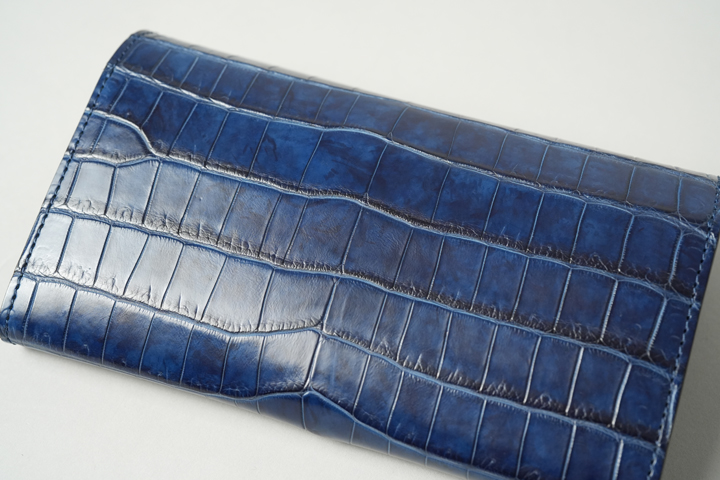 絶妙なデニムカラーの藍染クロコダイルを使用したWAVE。鮮やかで深みのある青色にほんのりと紫色が混ざり、天然の藍ゆえに複雑で奥行きのあるカラーリングに仕上がっています。紫外線との反応によっても色味が変化するため、使用環境によってさまざまな様相に変わるエイジングをお楽しみいただけます。