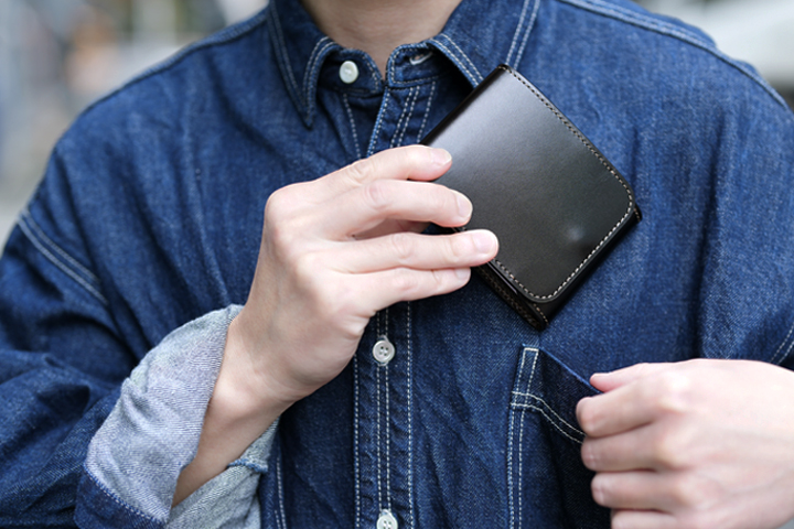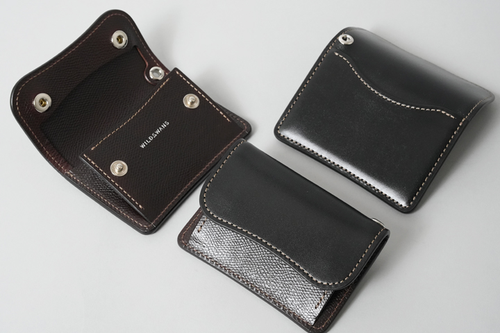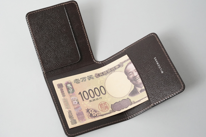金具を使わずに革で紙幣を挟み込むマネークリップです。 WILDSWANSのロゴが刻印されたポケットに紙幣を差し込み、あおりポケットが配置された側を紙幣に被せるように折り畳み、ロゴ入りポケット側をさらにその上に折り畳みます。 非常に薄いつくりになっていますので、胸ポケットなど収納場所を選びません。