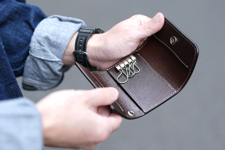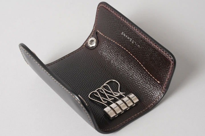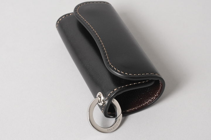 手のひらサイズの丸みがかわいらしいキーケースです。フラップに備えられた2点のホックを解除してフラップを開くと、内装にはamiet社の4連キーフックが取り付けられています。こちらは小のキーフックが3つ、大のキーフックが1つから構成されているため、様々な鍵に対応します。キーフックの下部にはハトメが備えられていますので、カラビナやチェーン、ストラップを接続して頂ければ、使用シーンの幅がぐっと広がります。
