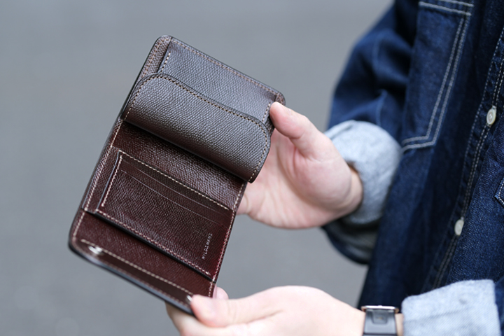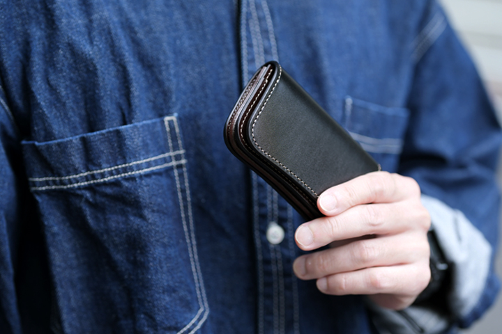 古き良きアメカジらしさを体感できるミドルウォレットです。留め具が付属しておりませんので、開いてすぐ直感的にお使い頂けます。内装の右側に位置するカードポケットは、2段のカードポケットと深めのカードポケットが1室用意されていますので、カードの種類や使用頻度により仕分けることが出来ます。内装の左側に位置するコインケース内には仕切りが備えられていますので、硬貨を仕分ける他、カードポケットに入りきらないカードを収納することも可能です。札室内の両脇に備えられた仕切りを利用することで紙幣を仕分けることも出来ます。