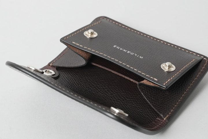 最小のお財布としても使用可能な、取り回しの良いコインケースです。背面に設けられたカードポケットにはプラスチック製のカードが1枚収納可能なため、使用頻度の高いカードを収納してお使いください。ホックを解除してフラップを開くと、コインケース部分が顔をのぞかせます。コインケース部分に備えられた仕切りを利用して、硬貨を仕分けたり、仕切りの背面側に3つ折りにした紙幣を収納することも可能です。さらにこちらのモデルにはハトメが設けられているので、カラビナやウォレットチェーンをつなげる他、長めのストラップをつなげて首から下げるなどフレキシブルにお使い頂けます。