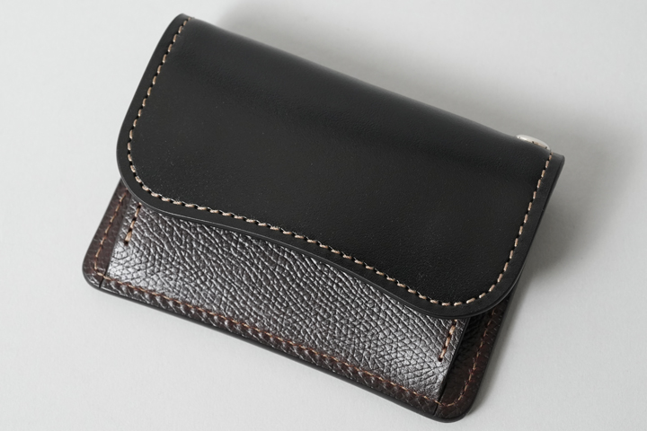 コバとマチの曲線が美しい名刺入れです。フラップには留め具がありませんので、革を少しずつ育てるのと同じく、フラップが閉じるまでしばらくの間お待ちください。内装のメイン収納部には一般的なサイズ・厚みの名刺であれば50枚ほど収納することが出来ます。ロゴが刻印されたポケットには名刺が1、2枚収納できますので、名刺交換の際に名刺の仮収納場としてお使い頂くと便利です。フラップ側の小さめのポケットには名刺ではなくメモなどを収納してください。