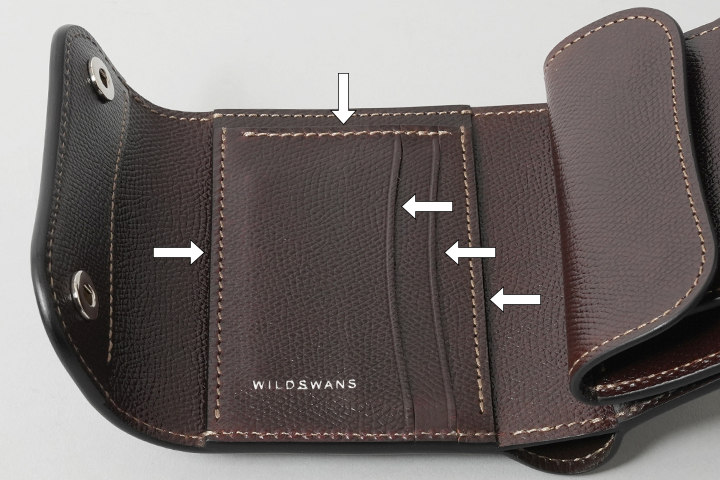 手に持った際の丸みがかわいらしい3つ折り財布です。コバが年輪のように見える様子は、パーツやユニットが多層に重なる3つ折り財布ならではの仕様です。内装の中心に位置するカードポケットユニットには、縦横3方向から収納するポケットが5室備えられています(画像内の矢印)。内装の右側にはTONGUEを思わせるコインケースが付属しています。なお、コインケースの背面にもカードポケットが1室ございます(画像内の矢印)。札室はコインケースの右サイドに用意されています。長さ、深さ共に余裕がありますので、紙幣を数十枚収納してもしっかりと収まります。