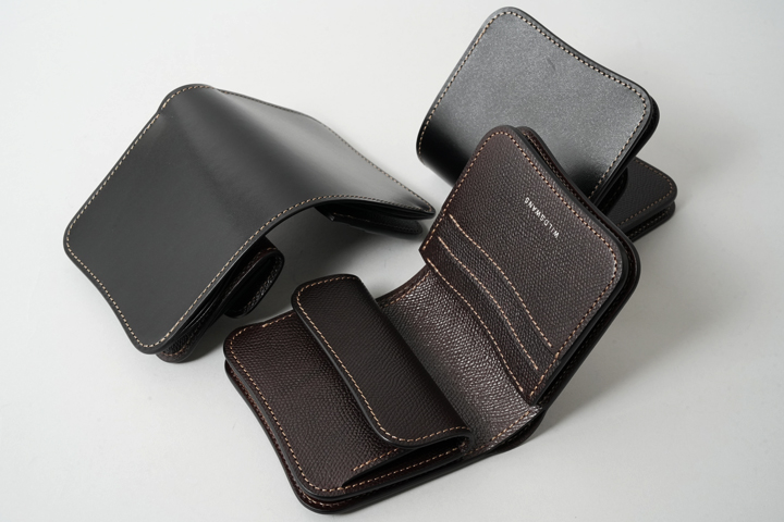 外装にはスムースのサドルプルアップ/ブラック、内装には型押しを施したサドルプルアップ/チョコを合わせています。元々耐久性に優れた革ですが型押しで熱と圧を加えることでさらにハリ感が生まれ、製品をより堅牢なものに仕上げています。