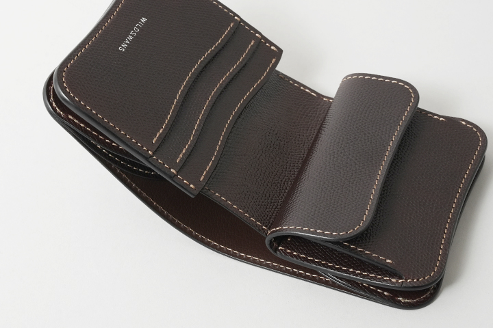 カードの収納に優れた近年人気のミニ財布です。 TONGUEと同じく外装の背面には便利なカードポケットを備えています。メインフラップを開くと専用のフラップが付いたコインケースが現れます。こちらのコインケースの中は1室構造ですが、コインケースフラップを手前に引き出すことで現れるスペースへ、カードをまとめて収納することができます。右サイドの札室は革で裏貼りがされていますので、ミニマムなスペースですがスムーズな紙幣の出し入れを可能にしています。