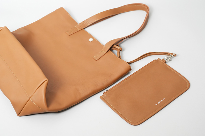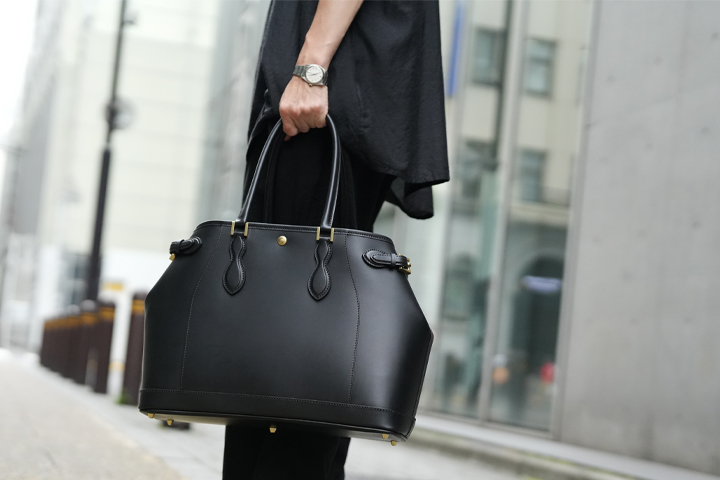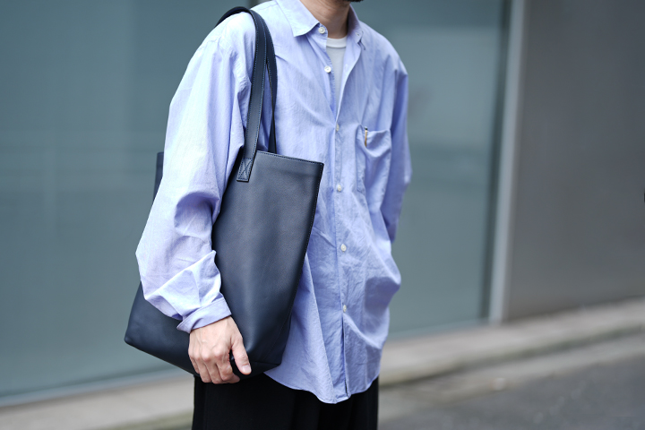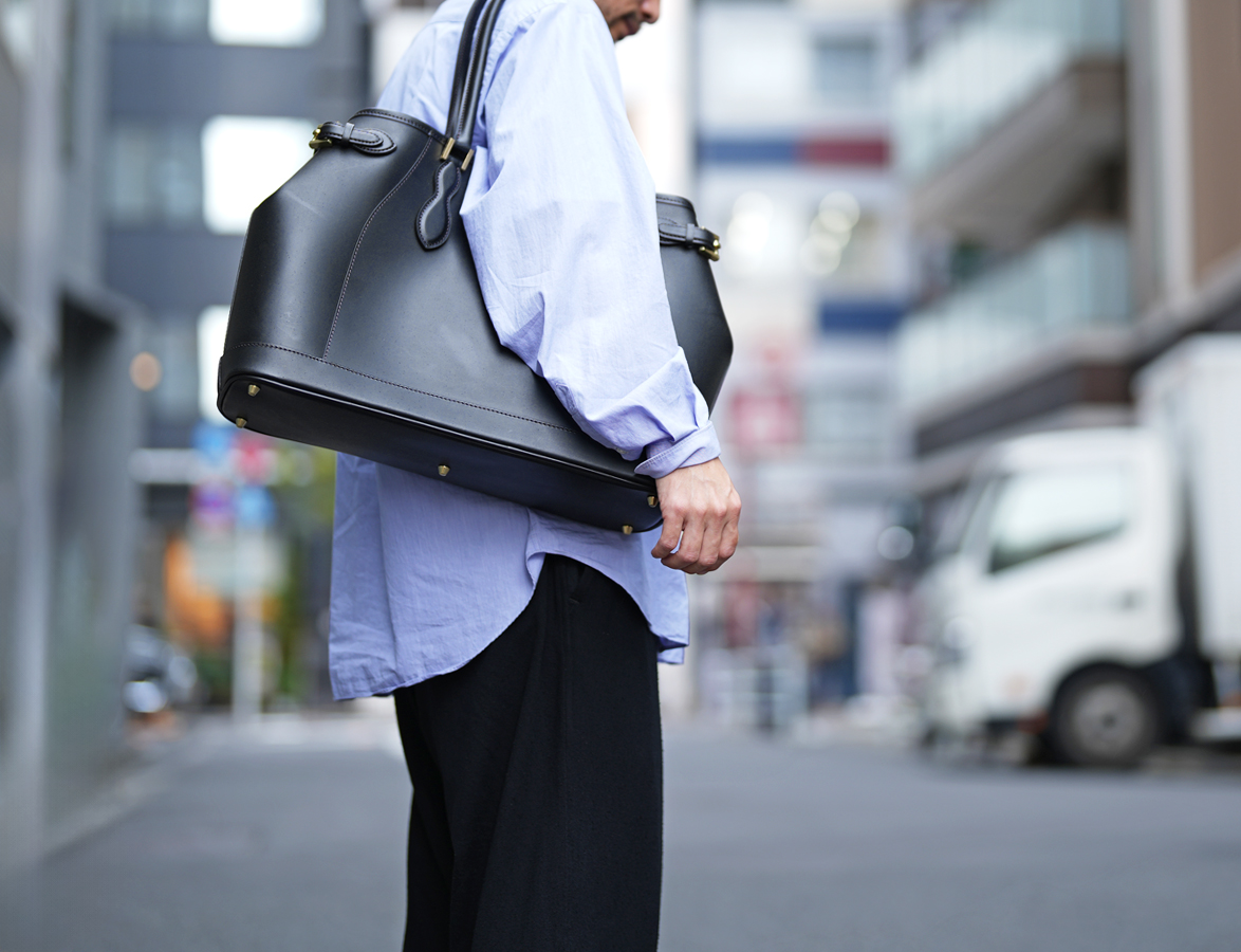 靴職人の福田洋平氏とのコラボレーション企画として新たに誕生した、受注生産にて販売中のトートバッグです(こちらの製品はご注文完了後3~6か月後のお届けとなります)。このアイテムはWILDSWANSの第二の製作拠点、WILDSWANS東京アトリエで製作しております。 目的の用途を果たし、かつ使いやすさや耐久性に富んだ「上質な道具」をコンセプトに何度も試作を重ね、ビジネスシーンにも休日にも合うようにシンプルなデザインを採用しています。胴体部分はテア、内装にダービー、ハンドルと側面・底面のパーツにフルグレインブライドルレザーと3つの皮革を贅沢に組み合わせており、独自の3層構造によってしっかりしたハリ感と耐久性を持ちます。どこに注目しても絵になる格上のバッグです。