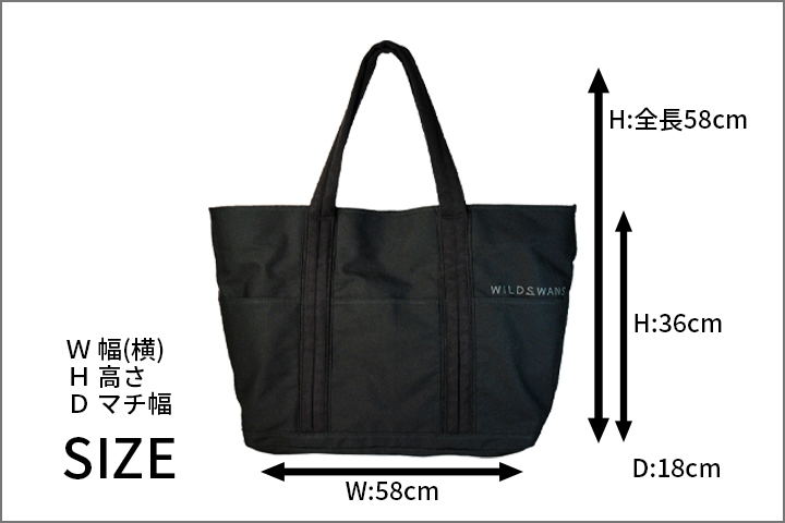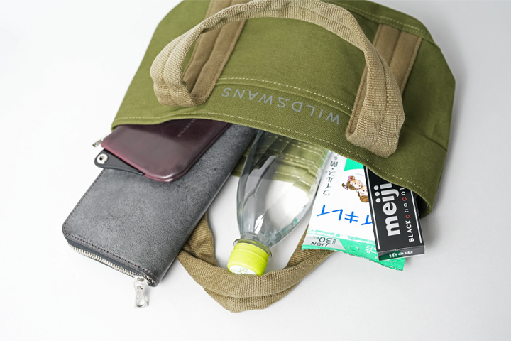 WILDSWANSでは畳んで持ち運べるエコバッグの取り扱いがいくつかございますが、今回はコットンキャンバス(11号帆布)を使用しているバッグをご紹介いたします。 外装は11号帆布、内装は撥水加工を施したポリエステルを採用している、軽量かつ耐久性の高いバッグです。ハンドルには心材を用いて程よい厚さを出しており、持ち運ぶときに手触りが良く、大きなLサイズでは重い荷物を肩にかけたまま過ごしても疲れにくい仕様です。さらにハンドル部分にメインカラーそれぞれに近しい別のカラーを採用することでデザイン性を高めています。その他主な共通の仕様として、外装にあるオープンポケット、内装に中身が見えにくくなるようにするホックなどがあります。