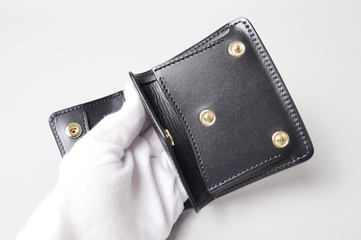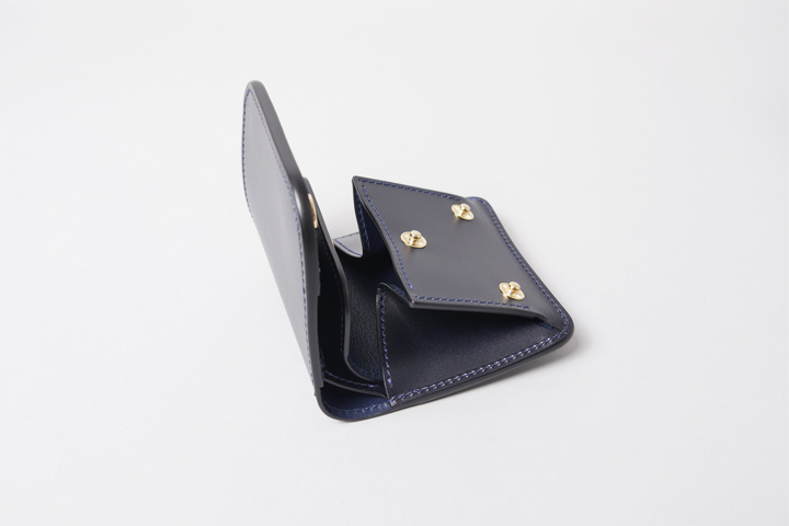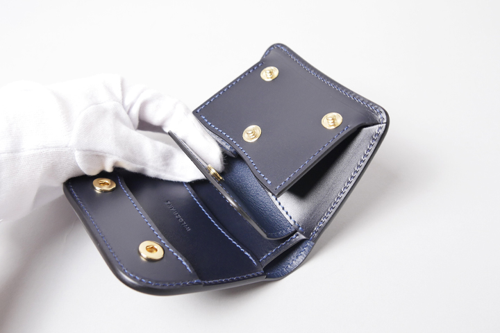 The coin compartment is designed with generous space in mind, featuring gussets on both sides that enhance its overall capacity. This thoughtful design ensures you can store a substantial amount of coins without worry. In the accompanying image, you can see the deep, rich navy color that adds a touch of elegance and sophistication to the overall aesthetic.