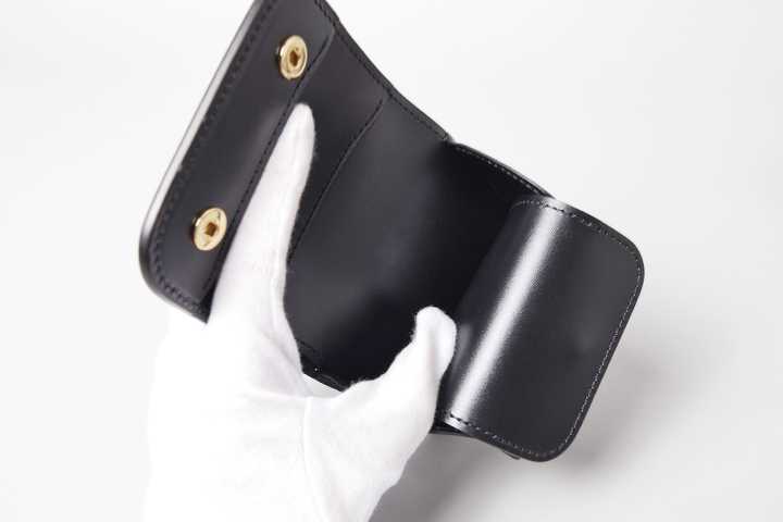 The interior features a flap-type coin case design that includes a card pocket on the back. Also inside the coin case, there’s a divider for holding cards. The main compartment has a single-chamber structure, which is thoughtfully lined to ensure that cash can be stored smoothly and look appealing.
