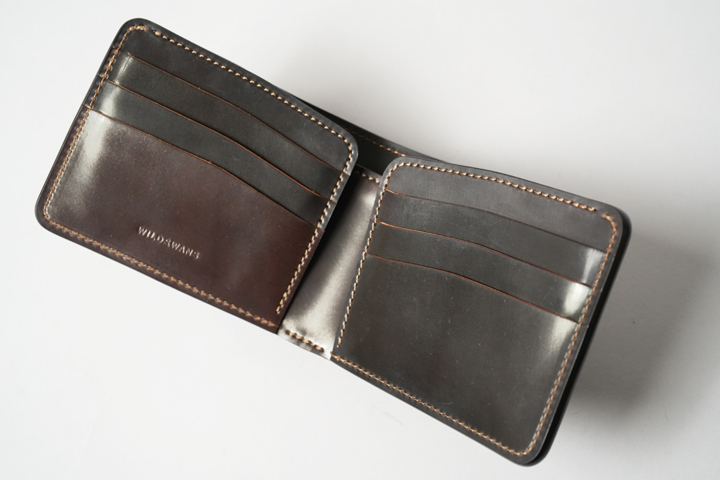 一方で、こちらはWILDSWANSが理想とするコードバンを追求して生まれた、ブランドのオリジナルコードバンです。油分の含有を抑えてハリ感を強めた仕上げと、使い始めのややマットな表情から、ご自身でじっくりと皮革を育てていくことができる育て甲斐のある皮革となっています。また特殊な鞣しの方法を用いることでコードバンの表層の強度を高め、水気や傷に強い特性を持たせています。もちろん全く水を吸わない、傷が付かないといったものではございませんが、コードバン革を扱ったことがないといった方にもおすすめできる皮革です。