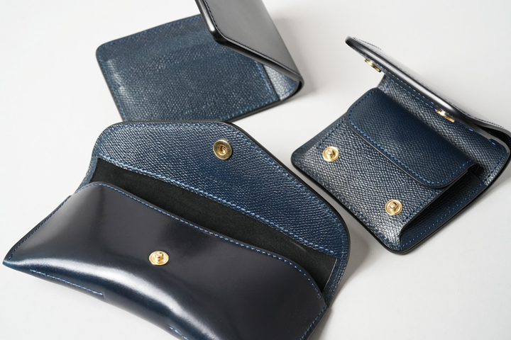 こちらも内装にサドルプルアップ/フレンチネイビーを使用したシリーズですが、型押し加工によるシボ感が特徴的です。見た目の印象だけでなく、皮革の繊維が引き締まることで耐久性も増し、より実用的な仕様となりました。