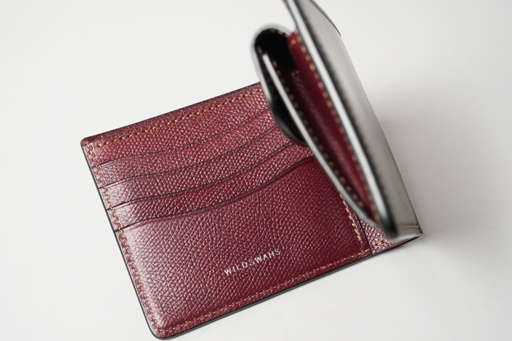 ブラックとバーガンディのコントラストが美しいクラシカルウォレット。薄型のようでいて、スペースを無駄にしない設計のため内容量もしっかりと確保しています。ゆったりと出し入れできる札室に取り出しやすいコインケース、カードは7枚ほど収納できます。スーツの内ポケットに入れてもシルエットが崩れず、なおかつ実用性に優れた大人の二つ折り財布です。