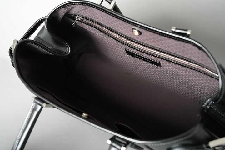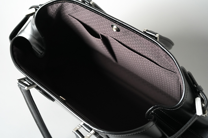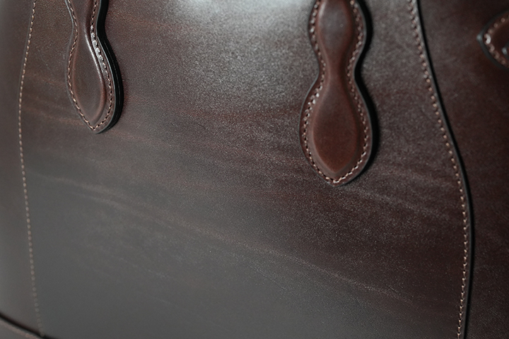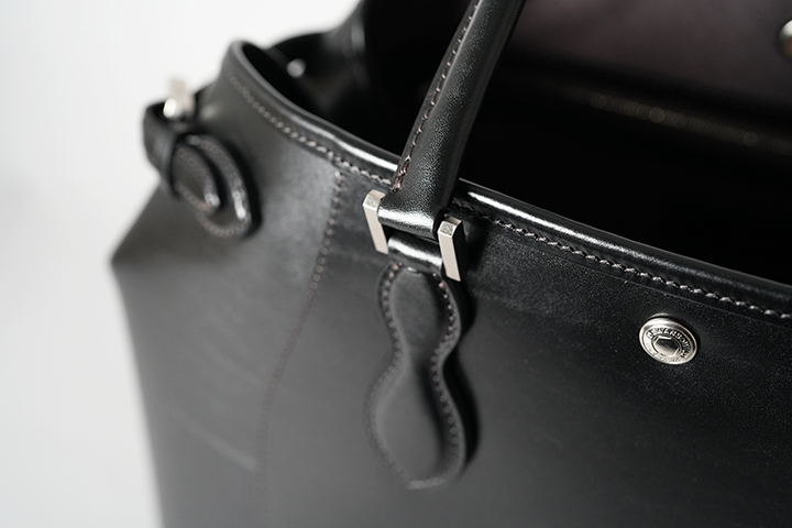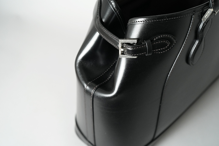 続いてDRUCKERの基本的な仕様についてご説明させて頂きます。いくつかのパーツに分かれていますが、本体の外装は大きく皮革を裁断したパーツを大胆に組み合わせています。ハンドルは男性でも余裕を持って肩掛けができるサイズに設定しています。デザイン的なアクセントにもなっているハンドル根革部分の金具はネジで留める構造になっています。新品時はかなりきつくネジを締めていますが、使用していくとネジに緩みが出る場合があるので、思わぬネジの落下を防ぐためにも少なくとも半年から1年に一度程度はマイナスドライバーを用いてネジの緩みがないか確認して頂くことをお勧めします。ハンドルと本体を繋ぐ根革部分は本体で使用するメイン素材のサドルプルアップを複数枚重ねて組み上げたパーツですが、沢山の荷物を収納しても問題が生じないようにがっしりと作られるています。また、DRUCKERの顔を形作る重要なパーツの一つです。この2つの根革の間には大変強力なホックが取り付けられています。次に本体の両サイドにはベルトが付属されます。通常こちらのベルトを締めた状態で使用しますが、ベルトを締めることで本体の側面に窪みが生まれる他、正面から見た時にもスタイリッシュな出で立ちとなります。なお、荷物が多い時や大きなものを収納する際はこちらのベルトを解除して使用することも可能です。また、ベルトにはそれぞれWILDSWANSオリジナルの金具が付属しますが、こちらの金具とベルトが見える面がDRUCKERの正面となります。本体の下部には安定性と強度に寄与する当て革をくるっと一周分巻いています。こちらは「はかま」と呼ばれる熟練した職人のみが成せる特殊な製法です。そして、底面にも本体と同じ素材の皮革パーツを組み合わせています。こちらには5つの底鋲(そこびょう)をあしらい、床や地面に皮革が直接触れないような仕様に仕上げています。こうして本体下部にもおいても頑強に製作されたDRUCKERは、しっかりと自立をします(ご使用環境などにより使用していくと自立しなくなるケースもございます。)。ハンドルも立てて保管ができるので、出かける時にサッと持ち運べる形状で保管できるのはうれしいポイントです。