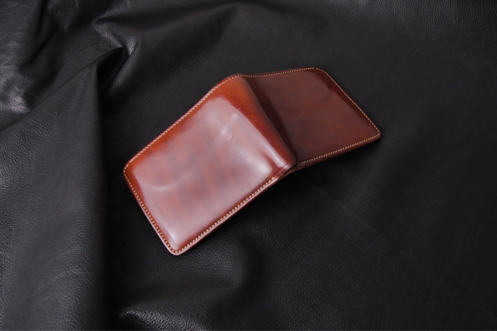While the interior does not bear the Horween stamp, the all-leather lining provides a luxurious feel. This wallet can hold approximately four cards, making it ideal for those with a modest number of cards. Additionally, it features a spacious bill compartment, making it a must-have wallet for cash enthusiasts.
