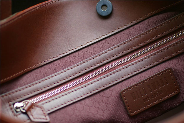 バッグの口部分中央はマグネットで留まります。内側の背胴側にはファスナーポケットが1つ付いています。前胴側には大小のオープンポケットが1つずつあります。写真では分かりにくいですが、エクセラファスナーも今回は黒ニッケルバージョンです。(ひたすらモノトーンの世界です。)