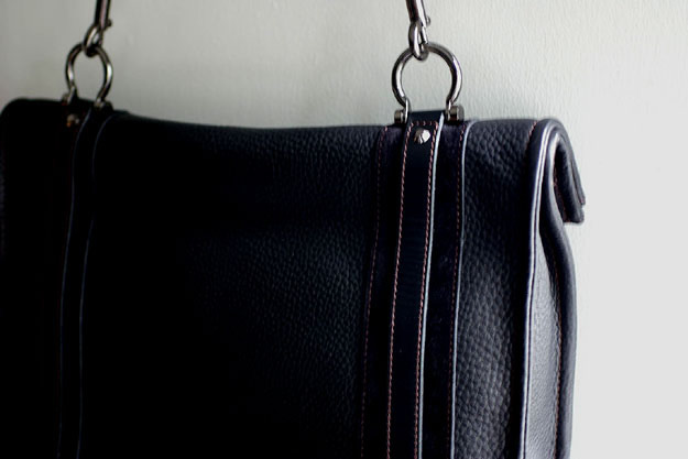 鞄の背面側です。ショルダーストラップを繋ぐΩ型の金具はマチ部分ではなく、鞄のトップに取り付けていて、鞄はぶら下がる形となります。