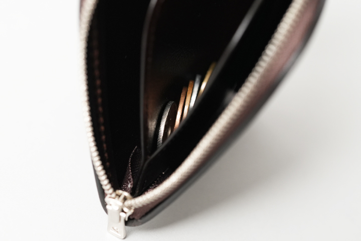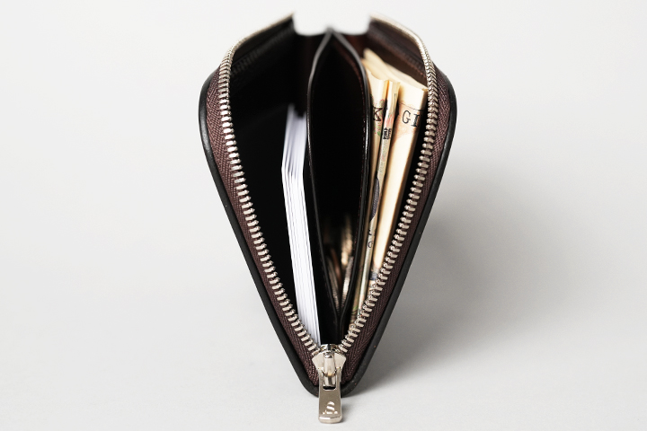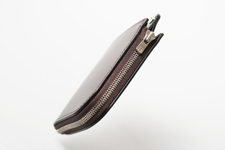 その名の通り隣接する2辺がLの文字のようにファスナーになっており、このファスナーで開閉するタイプのお財布です。