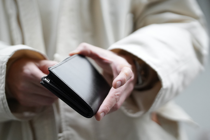 中央のコインケースは手前に傾けた際に硬貨が入り口に留まるよう、ポケットのように縫製されています。